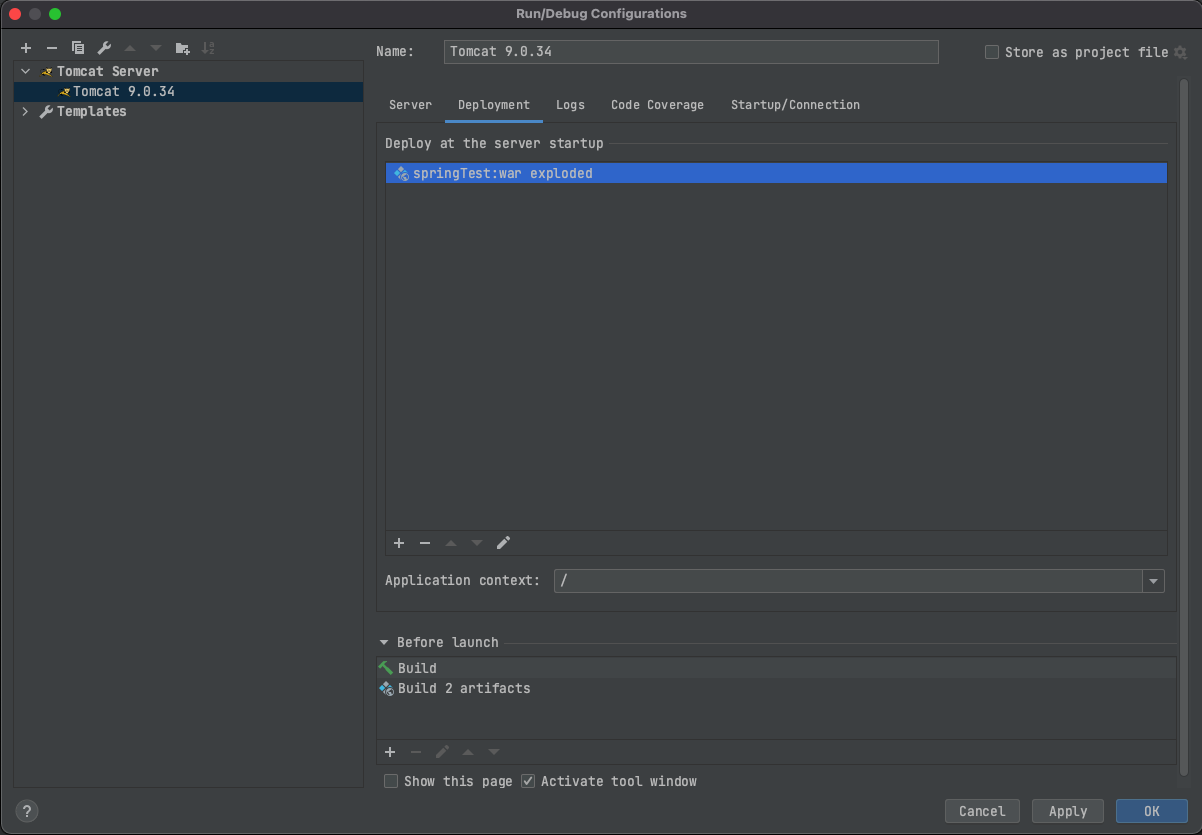 + 를 눌러서 추가해주거나 혹은 fix 버튼을 눌러서 아까 만들어 준것을 그대로 추가해준다. application context에는 컨트롤러에서 정의해준 대로 hello를 url에 추가해주면 index가 나오게 작성해줬기 때문에 기존의 것을 지우고 / 를 추가해준다.