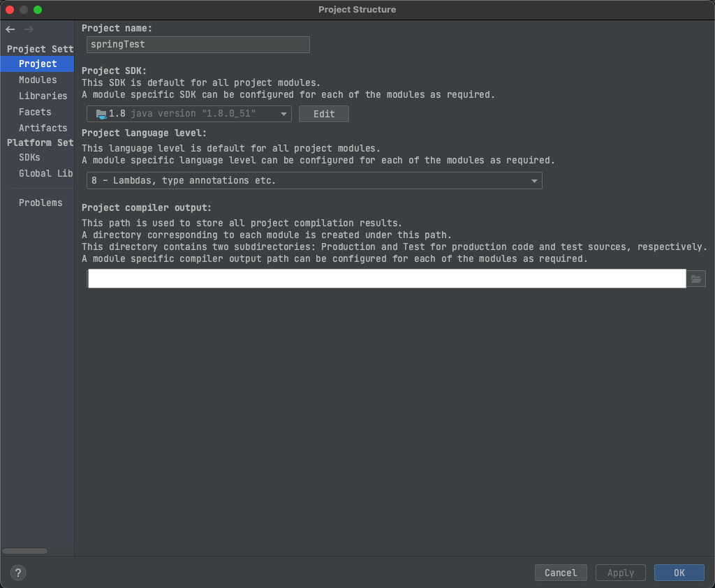 총 3군데에서 설정을 해줘야 한다. 맥에서 가장 상단에 보이는 메뉴에서 File - Project Structure을 선택해줘도 되고 프로젝트를 클릭한 상태에서 command + ; 를 눌러줘도 설정할 수 있다.