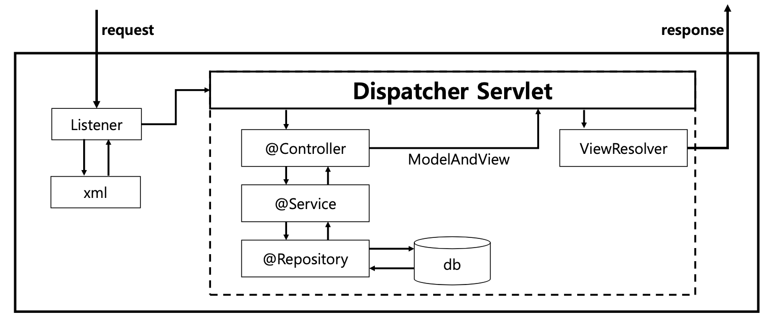 - DispathcherServlet 생성하고 사용자의 요청을 기다림